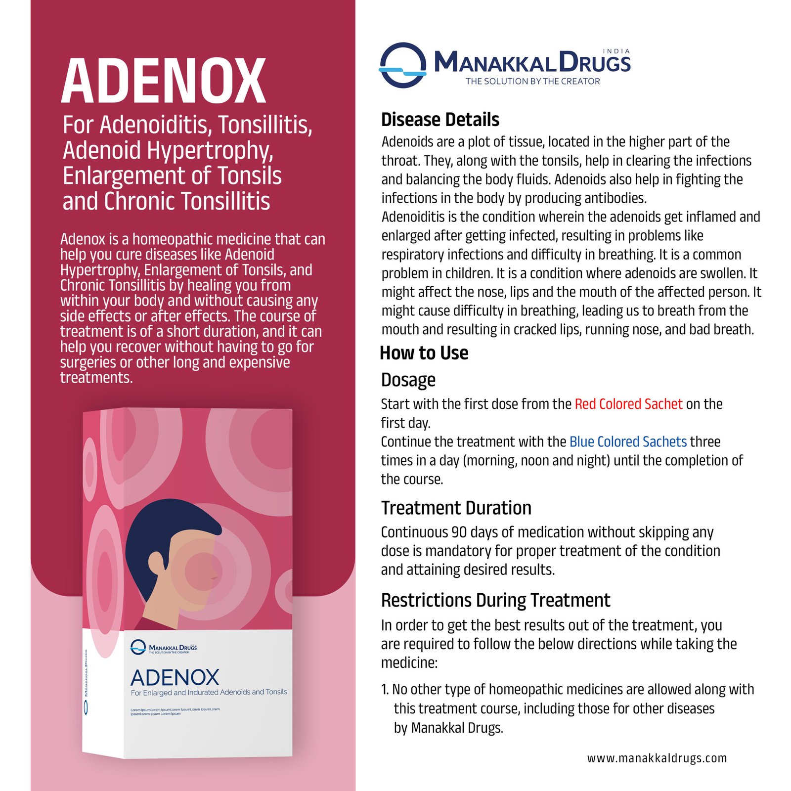 Adenox is a homeopathic medicine that can help you cure diseases like Adenoid Hypertrophy, Enlargement of Tonsils, and Chronic Tonsillitis by healing you from within your body and without causing any side effects or after effects. The course of treatment is of a short duration, and it can help you recover without having to go for surgeries or other long and expensive treatments.